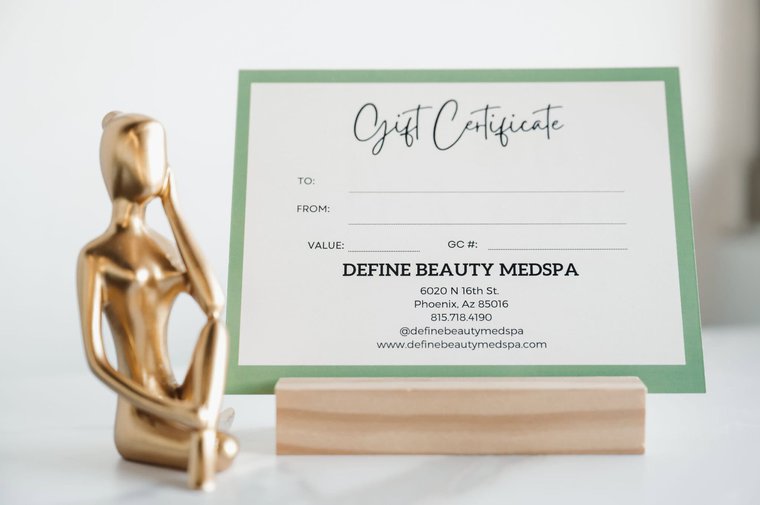 Define Beauty Medspa gift certificates are available for purchase both online and in-store, offering a convenient and thoughtful way to treat someone special.